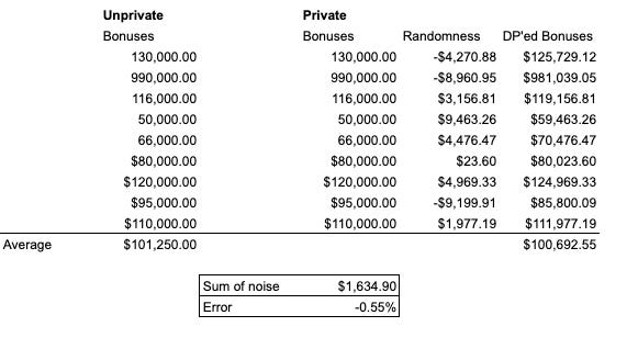 What happens when Mr. Asshole does his trickery now? Well, the average goes from $100,000….to something less than that after your contribution (we’re now averaging $100k with $97k, which reduces the average). Mr. Asshole think your bonus is lower than average when really it’s higher. A little bit of random noise added in to your data protects you from being snooped on.