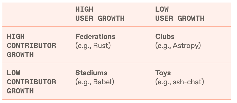 NE: Part of the reason why I wrote this book was because I feel like we've had this communitarian kibbutz kind of model, which you've identified, is the prevailing model that people understand in open source and that gets frequently talked about. And I think that narrative has kind of been owned by the likes of [Richard] Stallman or Eric Raymond or anyone who kind of remembers those early days of open source. And that model definitely still exists within the matrix of different community models. The ‘clubs’ are kind of like that, where everyone is rolling up their sleeves and there's lots of different active contributors. And then we also have the ‘federations’ that are kinda like the really big open source projects that we're used to thinking about like Linux, but then there’s the rise of the ‘stadium’ model that is, I think, much newer.