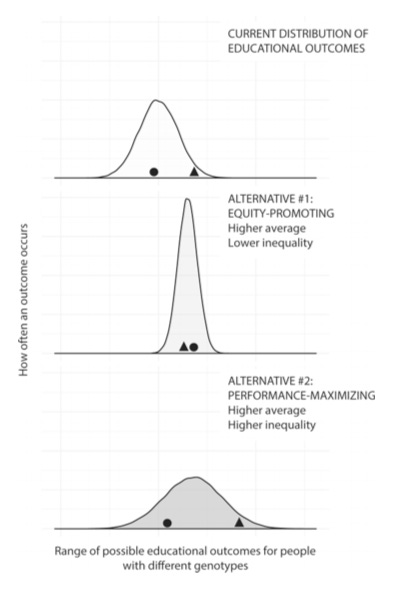 Alternative #2 is one idealized outcome: given smarter public policy as a result of sorting out the impacts of both genetics and environment, everyone is pushed to the educational maximum. The average outcome is higher for all concerned, but so is inequality of outcome. Harden references a common online meme about equity to make a point about how equity should work.