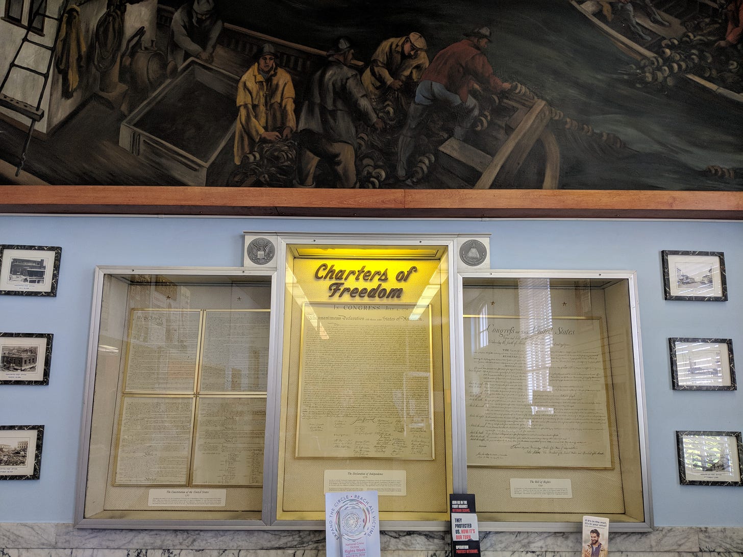 My favorite public building is the post office in Anacortes, a small port town perched on the northern tip of Fidalgo Island, WA. Inside, underneath a WPA-style mural picturing local fishermen slinging crab traps off a boat, is an illuminated display-case triptych titled CHARTERS OF FREEDOM. There, encased like saintly remains inside a Catholic reliquary, or (more aptly) like the torah scrolls in a synagogue’s ark, lay facsimile copies of the Declaration of Independence and the first two pages of the Constitution. Post office patrons are free to do their own patriotic simchat torah as they wait to buy stamps.