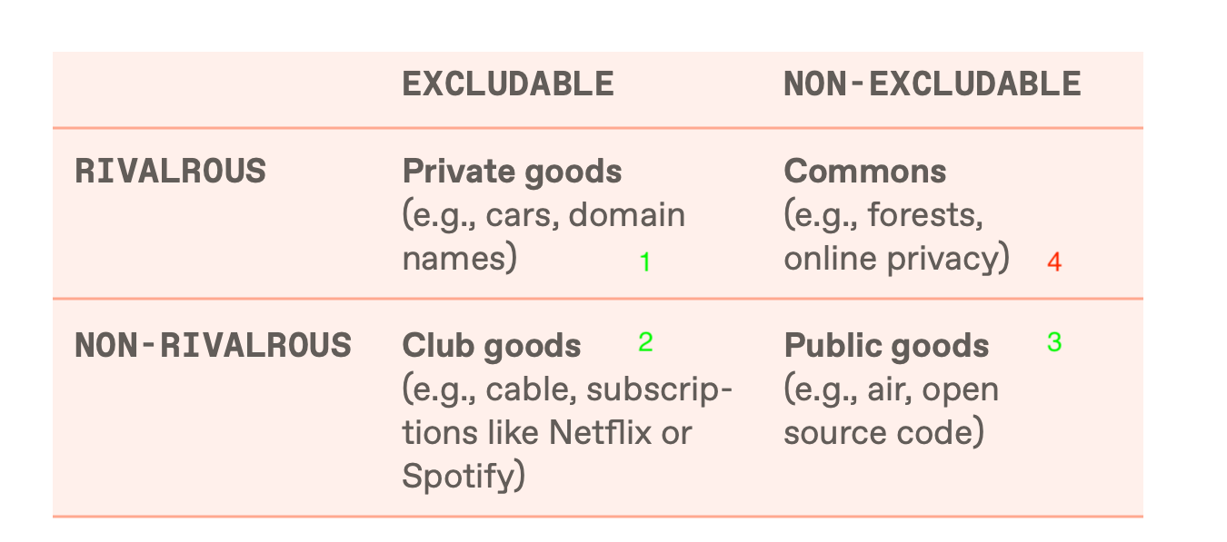 Broadly, the line between excludable and non is the line between where subscriptions vs. ads reign as business models. The line between rivalrous and non-rivalrous is that between human-driven attention (the ultimate luxury good in a digital economy) and the infinite reproduction of pixels and bits. Box 1 is the VIP room, box 2 is cattle class, box 3 is freebies like Wikipedia and ads-supported sites like BuzzFeed, and box 4 is the digital latrine where every online spat is unfolding on every hellsite in the world.