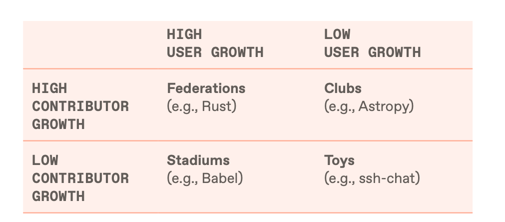 Here, Eghbal finally shows her cards. Working In Public, despite being a superlative book-length tour of the open source movement, isn’t really about collaborative software development. It’s really about how a virtualized, digital world decoupled from the physical constraints of manufacturing and meatspace politics manages to both pay for and govern itself despite no official legal frameworks nor institutional enforcement mechanisms. Every class of open source project in Eghbal’s typology can be extended to just about every digital community you interact with, across the Internet.